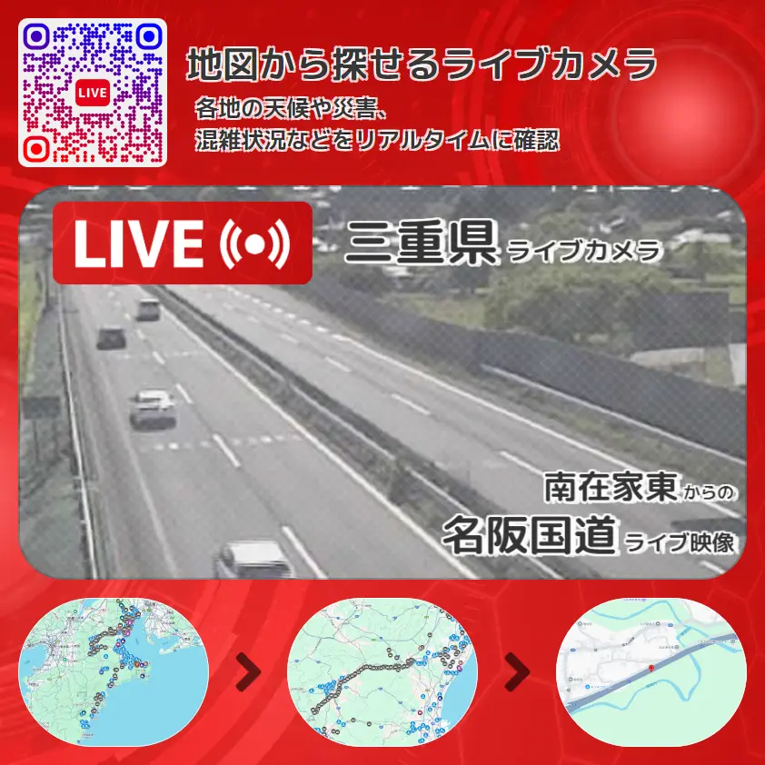 名阪国道(国道25号バイパス)の他に、高速道路(高速自動車国道に並行する一般国道自動車専用道路)や周辺の気象状況も併せてチェックすることが可能で、台風・大雨・地震などの災害による被害状況も把握することができます。