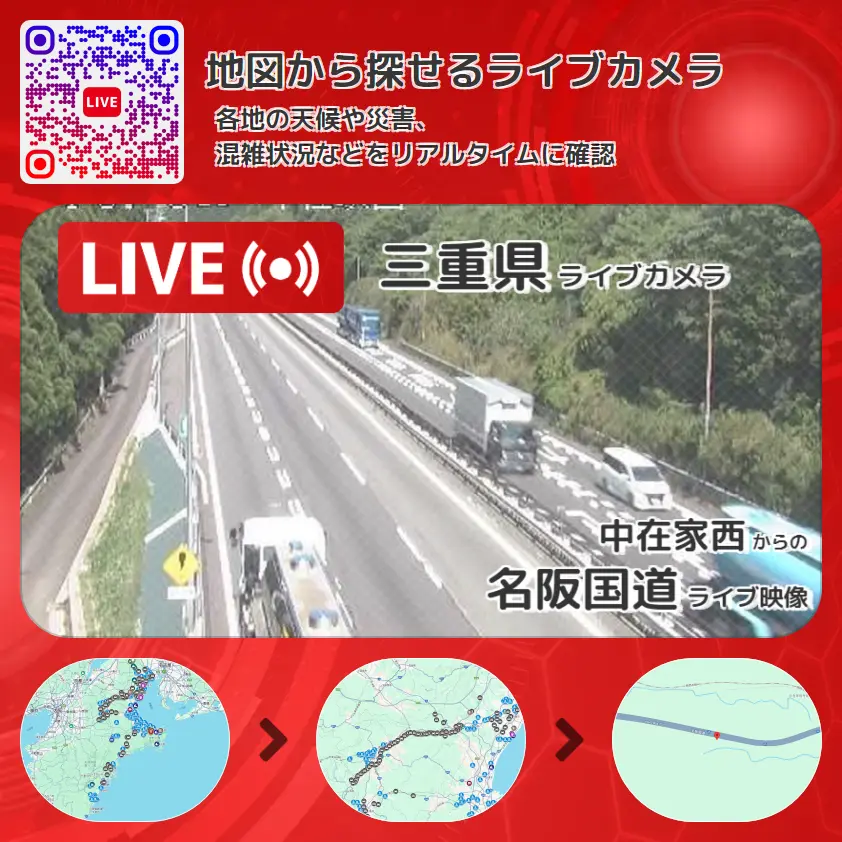 名阪国道(国道25号バイパス)の他に、名阪国道Bブロック(南在家インターチェンジ~下柘植インターチェンジ)や周辺の気象状況も併せてチェックすることが可能で、台風・大雨・地震などの災害による被害状況も把握することができます。