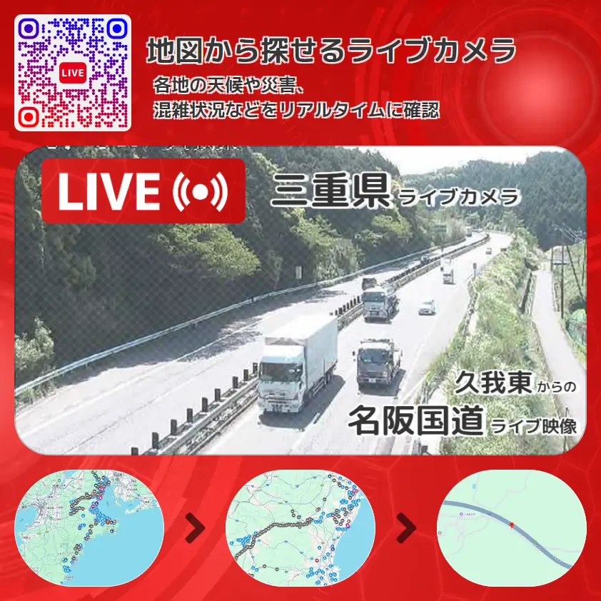 名阪国道(国道25号バイパス)の他に、名阪国道Aブロック(亀山インターチェンジ~板屋インターチェンジ)や周辺の気象状況も併せてチェックすることが可能で、台風・大雨・地震などの災害による被害状況も把握することができます。