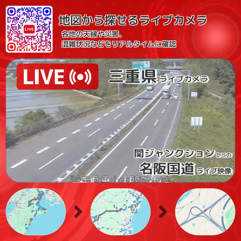 名阪国道(国道25号バイパス)の他に、名阪国道Aブロック(亀山インターチェンジ~板屋インターチェンジ)や周辺の気象状況も併せてチェックすることが可能で、台風・大雨・地震などの災害による被害状況も把握することができます。