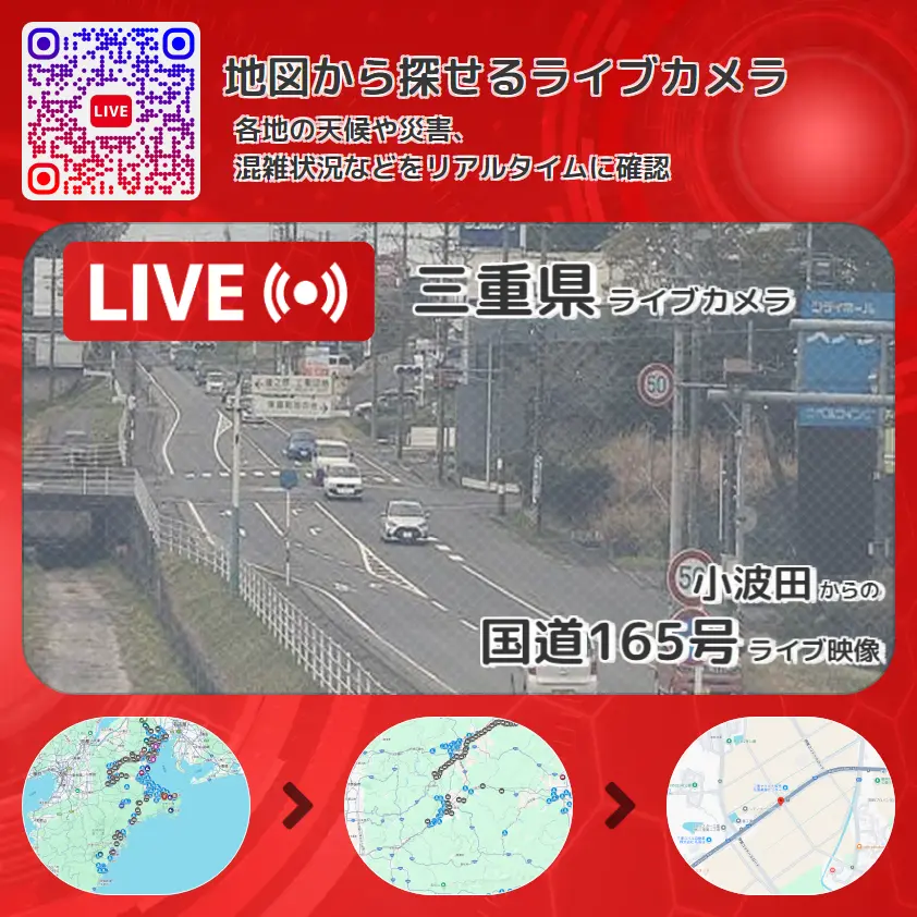 国道165号(小波田)の他に、初瀬街道や周辺の気象状況も併せてチェックすることが可能で、台風・大雨・地震などの災害による被害状況も把握することができます。