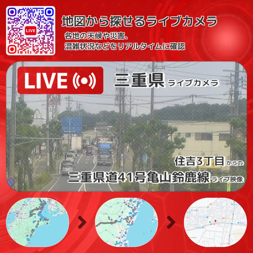 三重県道41号亀山鈴鹿線の他に、住吉三丁目交3差点や周辺の気象状況も併せてチェックすることが可能で、台風・大雨・地震などの災害による被害状況も把握することができます。
