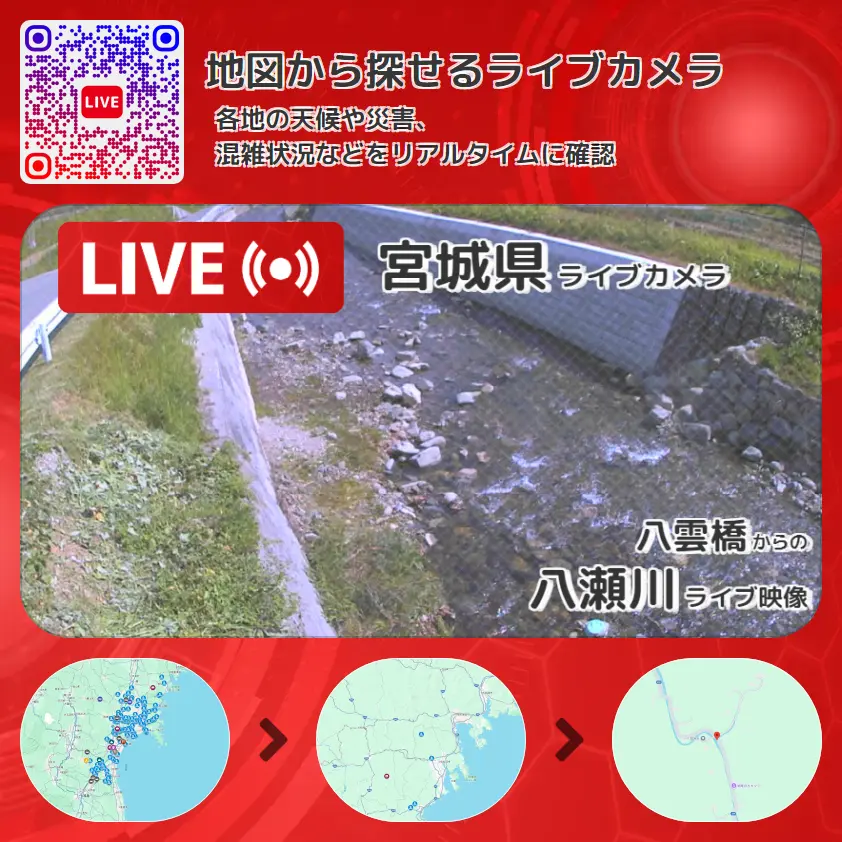 八瀬川の他に、宮城県道209号上八瀬気仙沼線や周辺の気象状況も併せてチェックすることが可能で、台風・大雨・地震などの災害による被害状況も把握することができます。