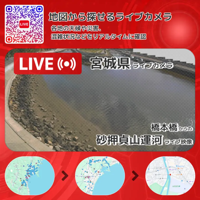 砂押貞山運河の他に、砂押貞山運河砂押川合流地点方面や周辺の気象状況も併せてチェックすることが可能で、台風・大雨・地震などの災害による被害状況も把握することができます。
