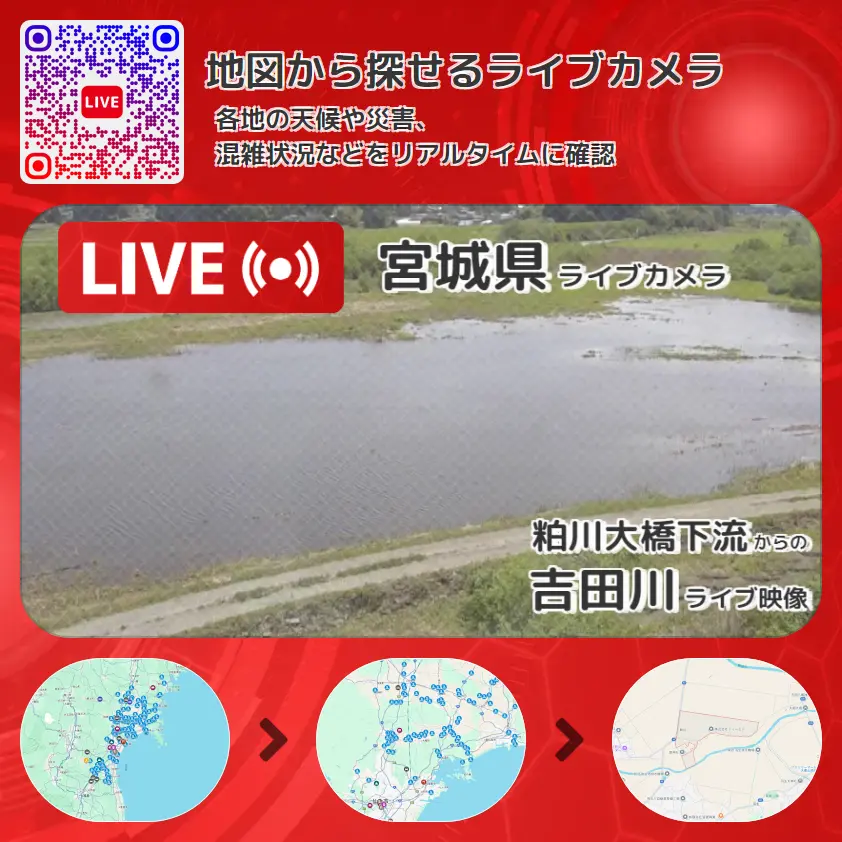粕川大橋下流から、吉田川が確認できるライブカメラです。