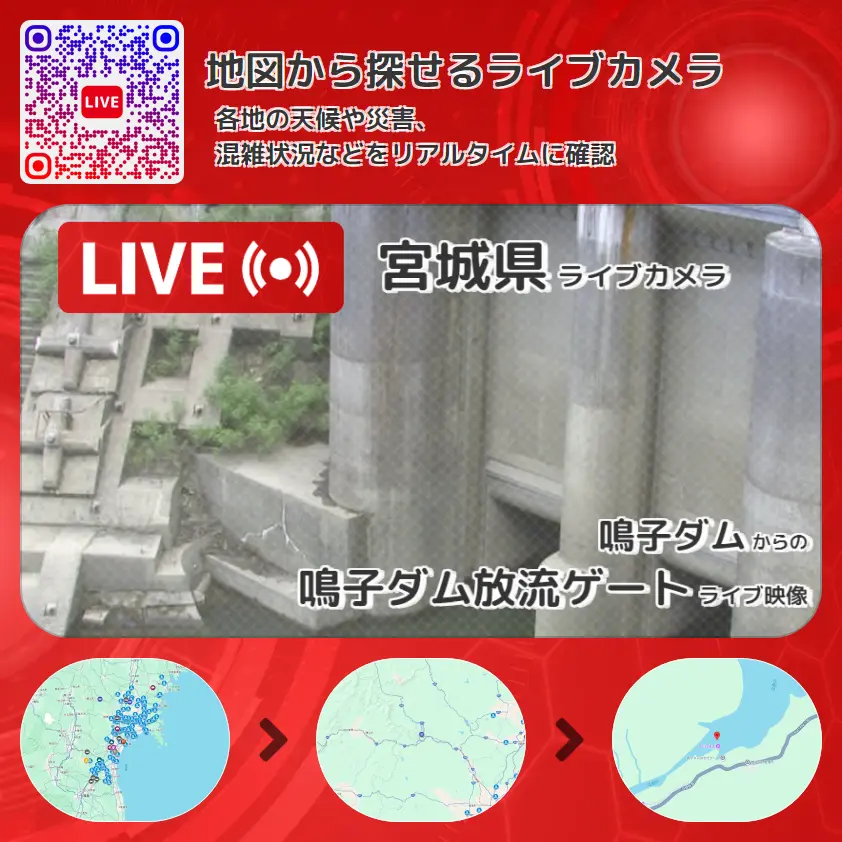 周辺の気象状況も併せてチェックすることが可能で、台風・大雨・地震などの災害による被害状況も把握することができます。