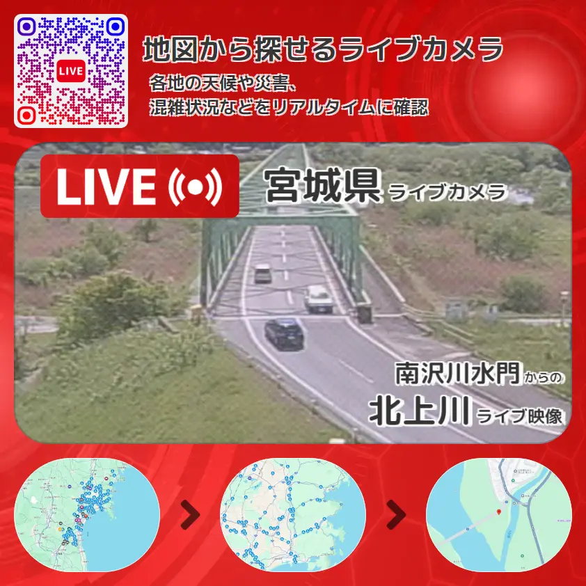 北上川の他に、柳津大橋や周辺の気象状況も併せてチェックすることが可能で、台風・大雨・地震などの災害による被害状況も把握することができます。