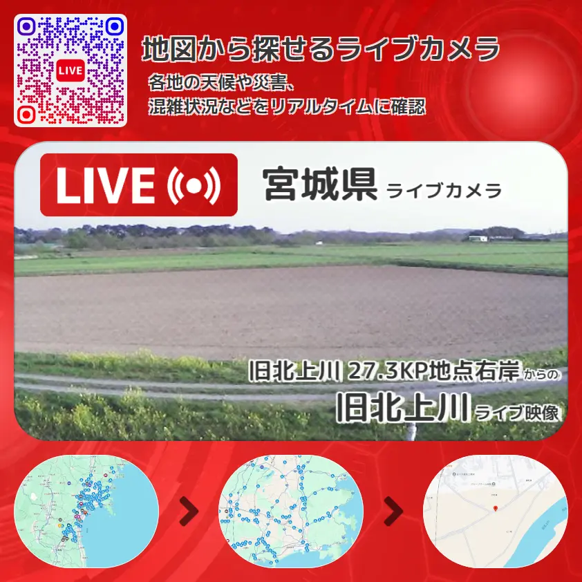 周辺の気象状況も併せてチェックすることが可能で、台風・大雨・地震などの災害による被害状況も把握することができます。