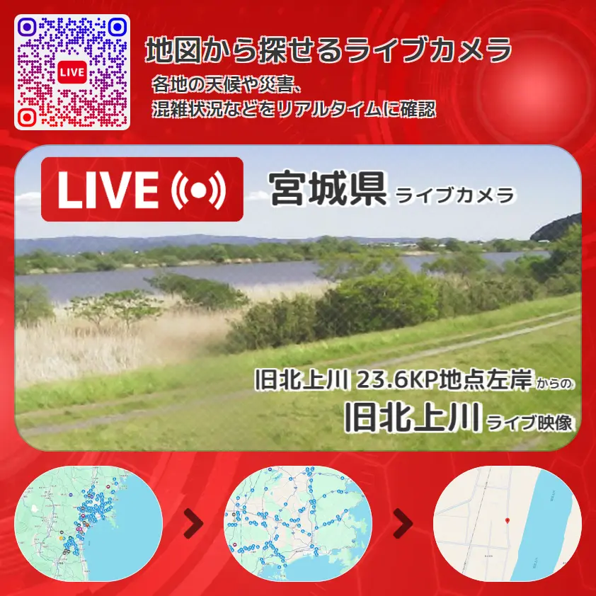 周辺の気象状況も併せてチェックすることが可能で、台風・大雨・地震などの災害による被害状況も把握することができます。