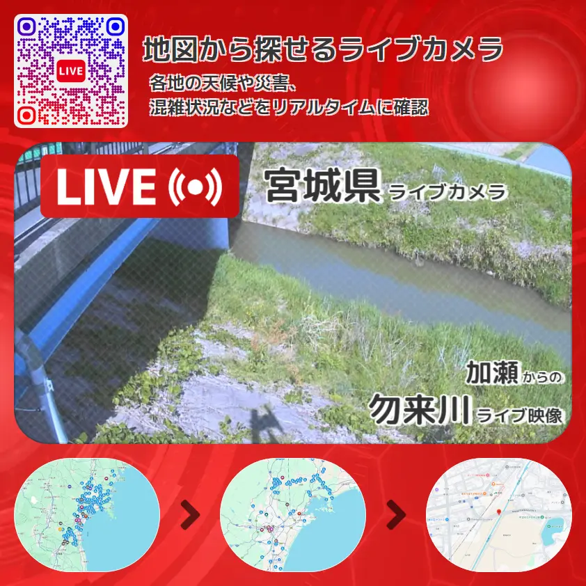 勿来川(名古曽川)の他に、宮城県道3号塩釜吉岡線(利府バイパス)や周辺の気象状況も併せてチェックすることが可能で、台風・大雨・地震などの災害による被害状況も把握することができます。