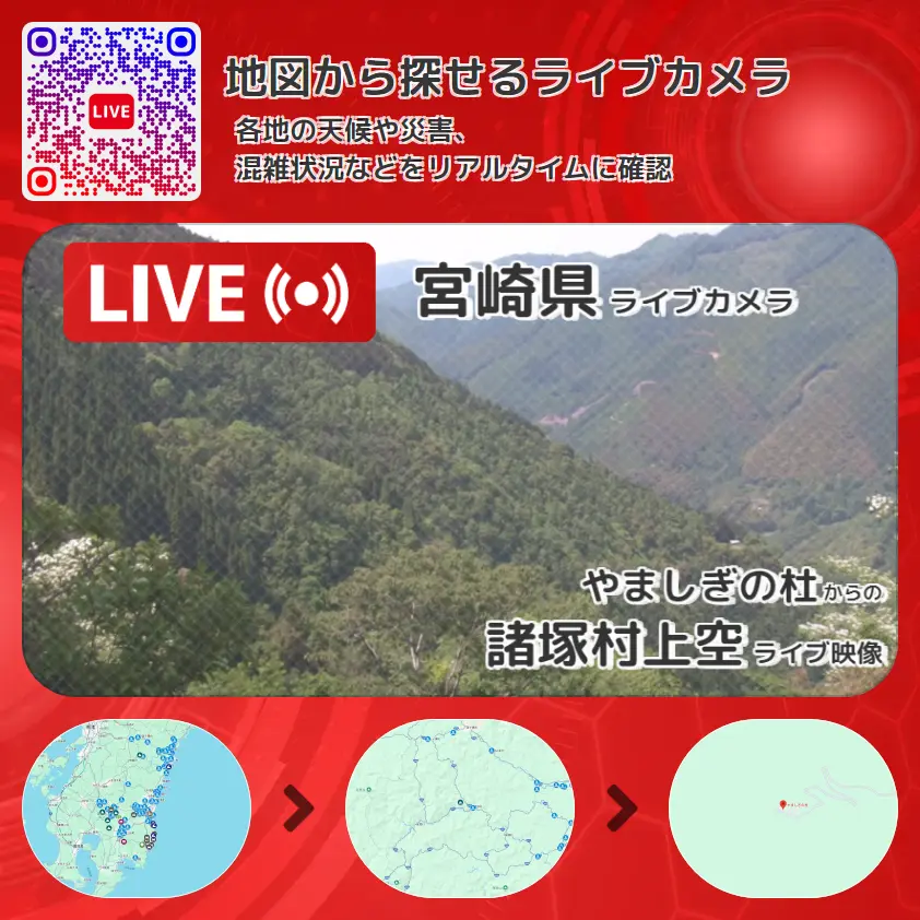 諸塚村上空の他に、諸塚の山々や周辺の気象状況も併せてチェックすることが可能で、台風・大雨・地震などの災害による被害状況も把握することができます。