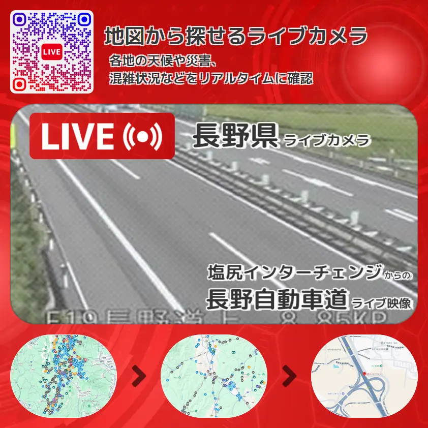 周辺の気象状況も併せてチェックすることが可能で、台風・大雨・地震などの災害による被害状況も把握することができます。