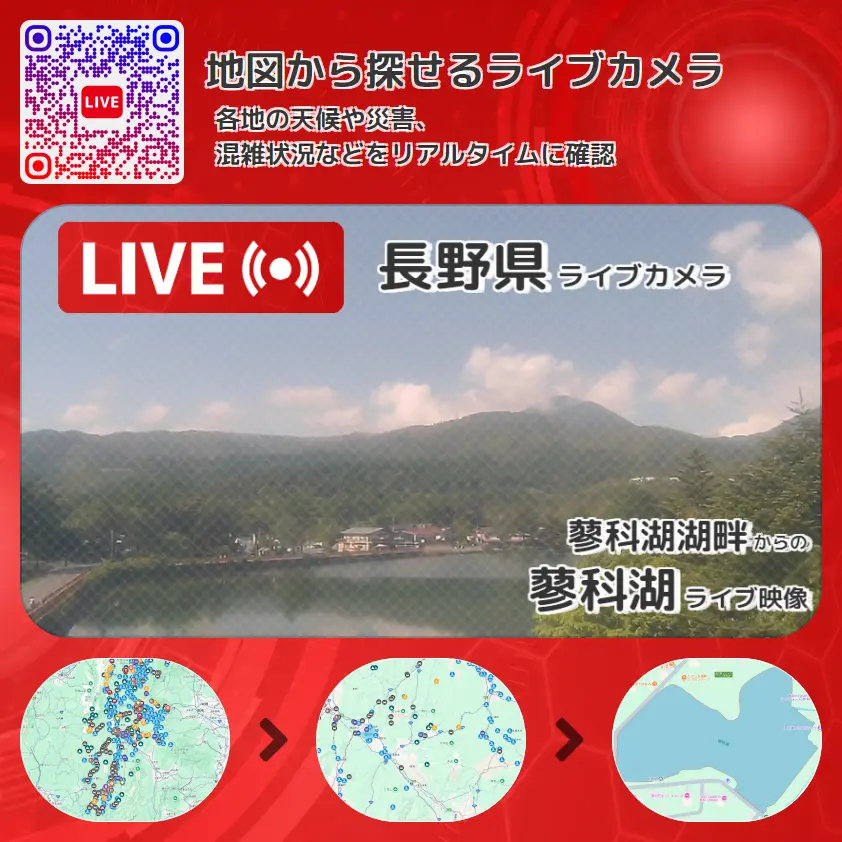 蓼科湖の他に、道の駅 ビーナスライン蓼科湖や周辺の気象状況も併せてチェックすることが可能で、台風・大雨・地震などの災害による被害状況も把握することができます。
