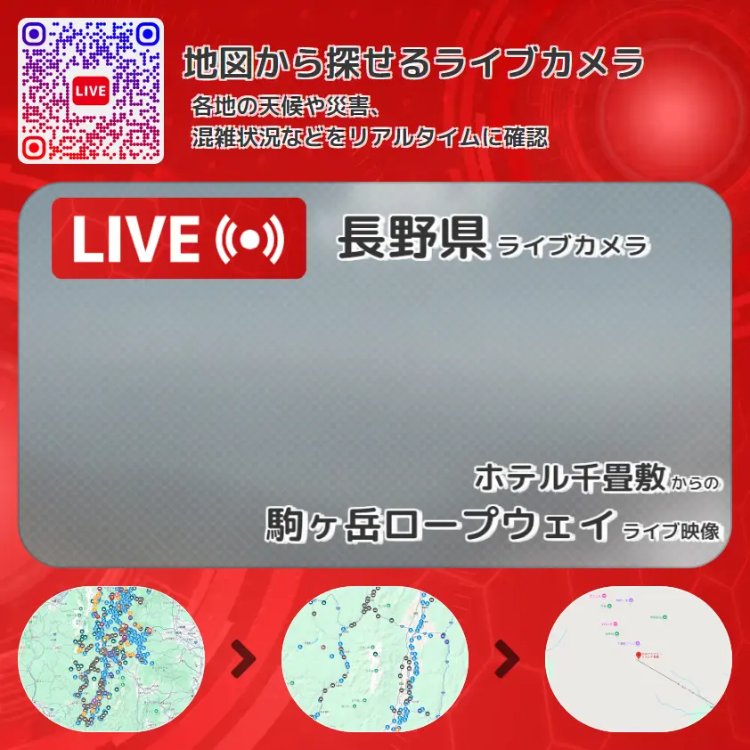 駒ヶ岳ロープウェイの他に、南アルプスや周辺の気象状況も併せてチェックすることが可能で、台風・大雨・地震などの災害による被害状況も把握することができます。