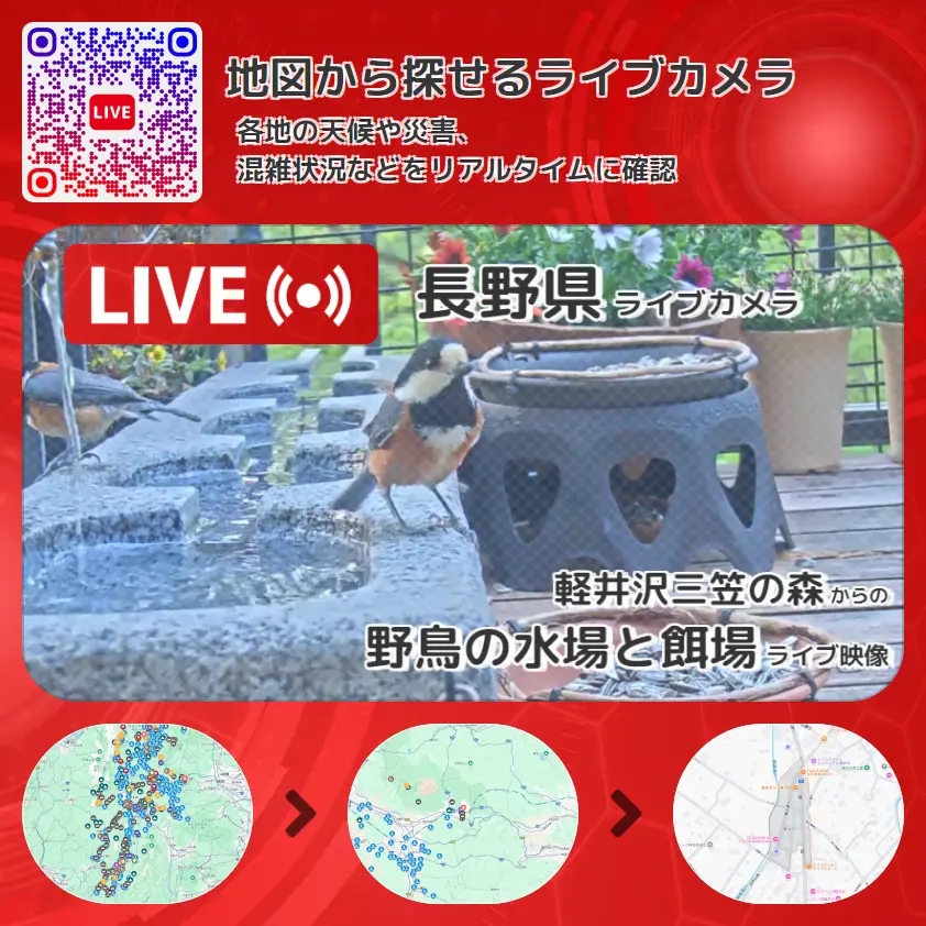 野鳥の水場と餌場(シジュウカラ・ヤマガラ・ヒガラ・ゴジュウカラ・エナガ・メジロ・キビタキ・オオルリ・コルリ)の他に、シマリスや周辺の気象状況も併せてチェックすることが可能で、台風・大雨・地震などの災害による被害状況も把握することができます。