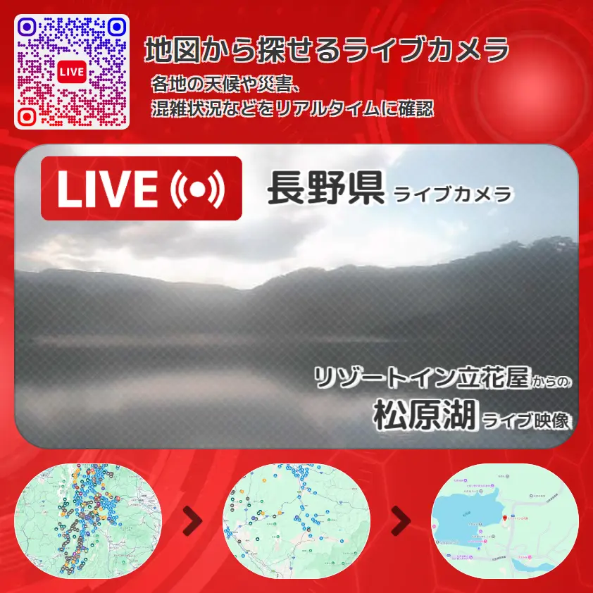 松原湖の他に、氷上ワカサギ釣りや周辺の気象状況も併せてチェックすることが可能で、台風・大雨・地震などの災害による被害状況も把握することができます。