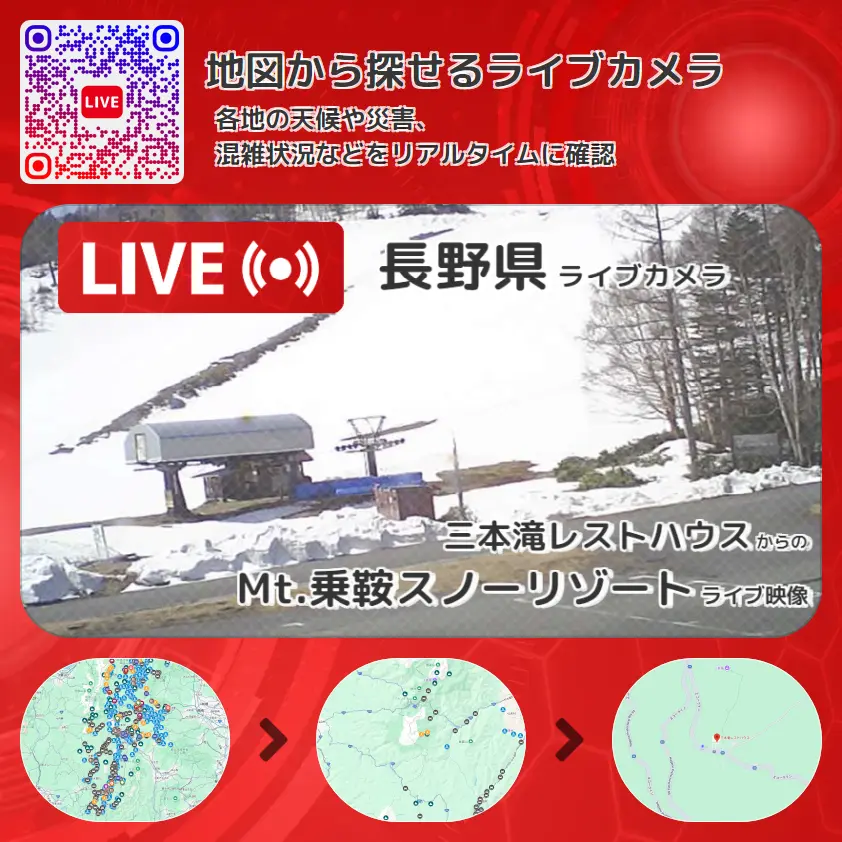Mt.乗鞍スノーリゾートの他に、かもしかコースや周辺の気象状況も併せてチェックすることが可能で、台風・大雨・地震などの災害による被害状況も把握することができます。