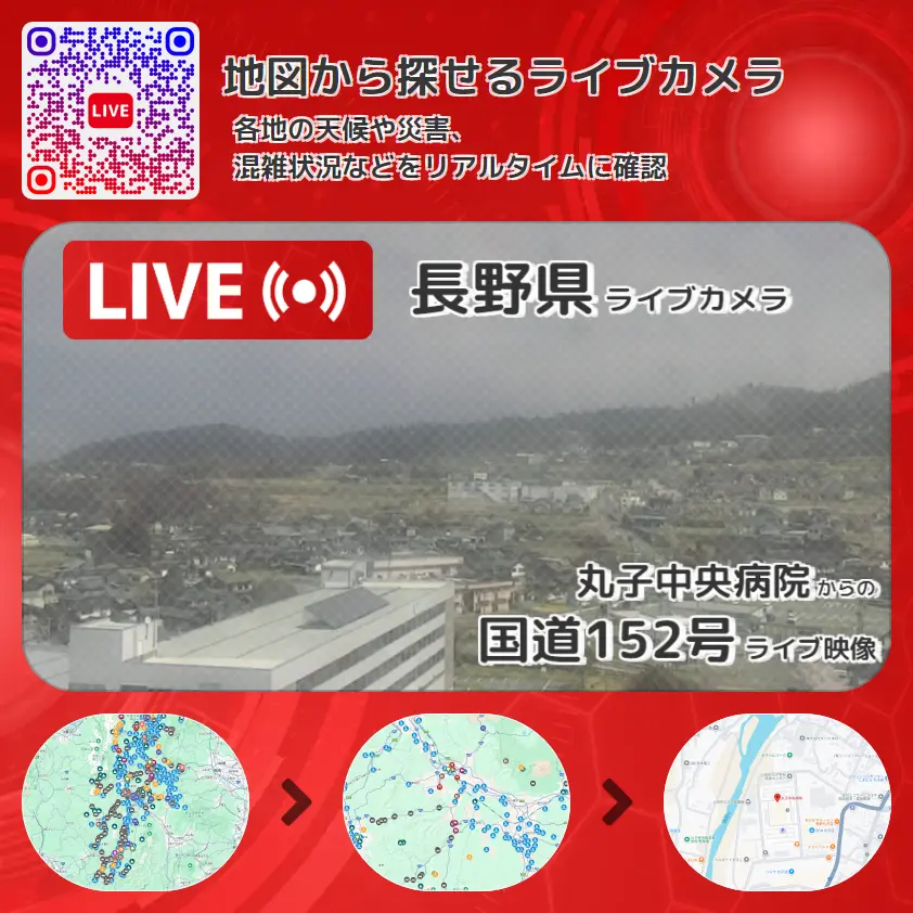 国道152号の他に、長野県道81号丸子東部インター線や周辺の気象状況も併せてチェックすることが可能で、台風・大雨・地震などの災害による被害状況も把握することができます。