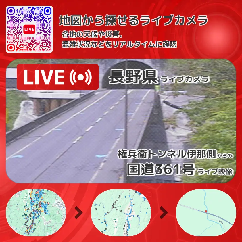国道361号(権兵衛峠道路)の他に、権兵衛トンネルや周辺の気象状況も併せてチェックすることが可能で、台風・大雨・地震などの災害による被害状況も把握することができます。