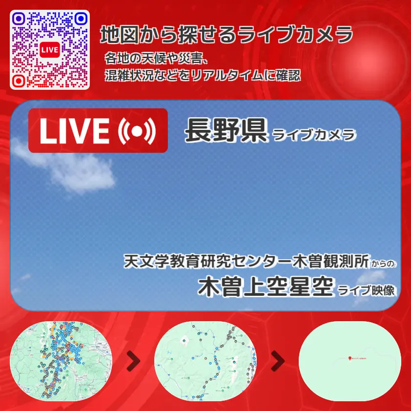 木曽上空星空の他に、星座や周辺の気象状況も併せてチェックすることが可能で、台風・大雨・地震などの災害による被害状況も把握することができます。
