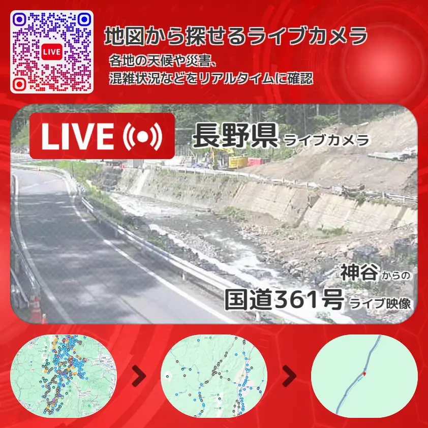 国道361号(権兵衛街道)の他に、神谷川や周辺の気象状況も併せてチェックすることが可能で、台風・大雨・地震などの災害による被害状況も把握することができます。