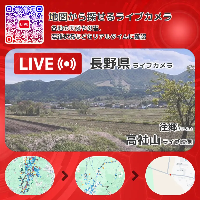 高社山の他に、田園風景や周辺の気象状況も併せてチェックすることが可能で、台風・大雨・地震などの災害による被害状況も把握することができます。