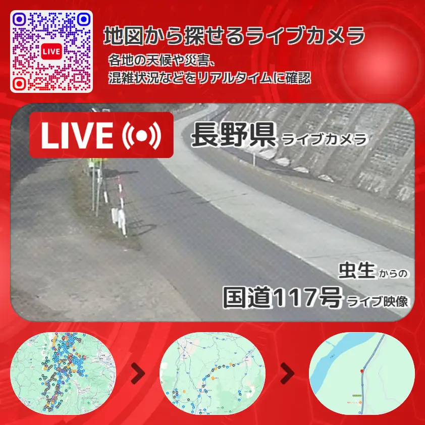 国道117号の他に、長野県道403号飯綱高原浅川線や周辺の気象状況も併せてチェックすることが可能で、台風・大雨・地震などの災害による被害状況も把握することができます。