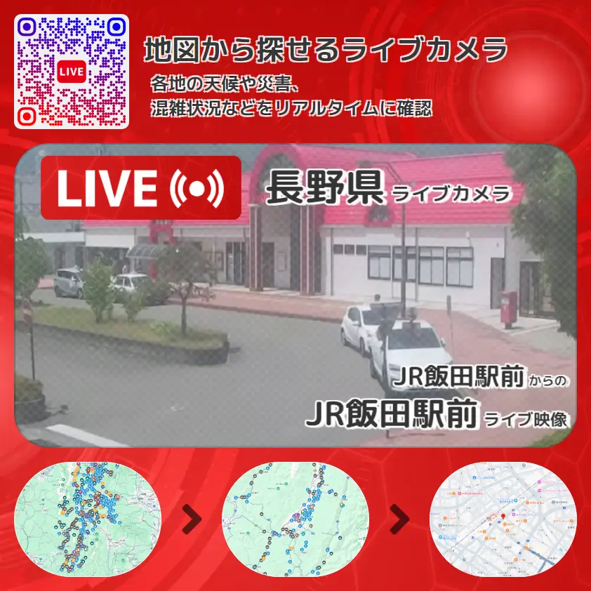 JR飯田駅前(JR東海飯田線)駅舎の他に、飯田駅前商店街や周辺の気象状況も併せてチェックすることが可能で、台風・大雨・地震などの災害による被害状況も把握することができます。