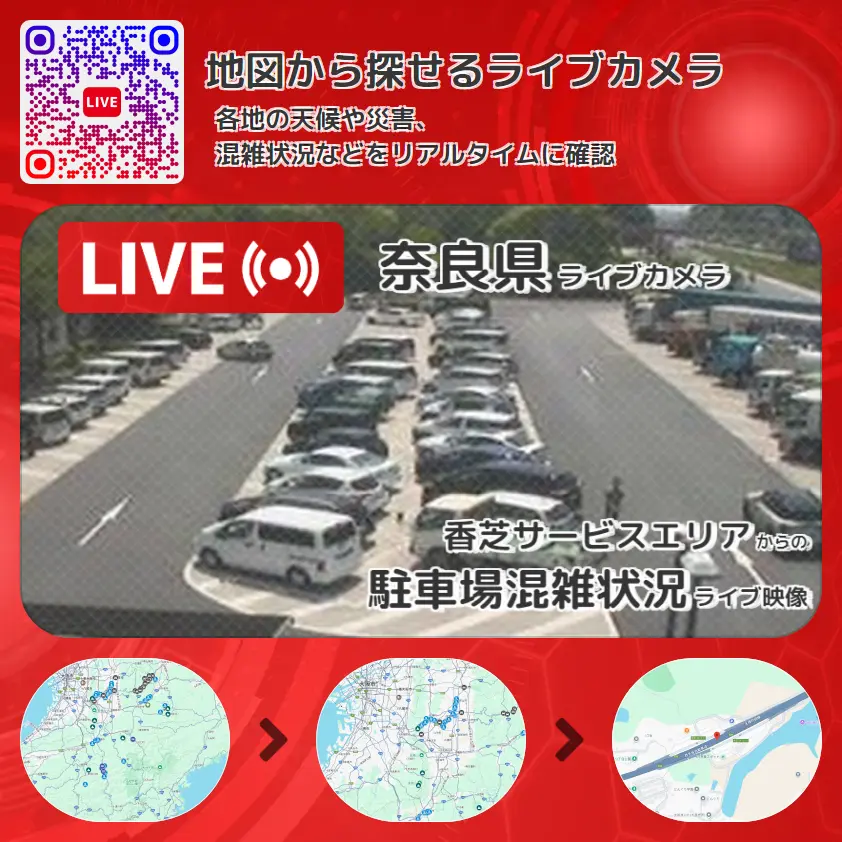 駐車場混雑状況の他に、西名阪自動車道(西名阪道)や周辺の気象状況も併せてチェックすることが可能で、台風・大雨・地震などの災害による被害状況も把握することができます。