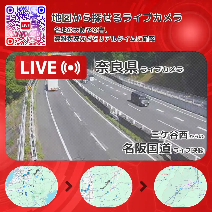 名阪国道(国道25号バイパス)の他に、高速道路(高速自動車国道に並行する一般国道自動車専用道路)や周辺の気象状況も併せてチェックすることが可能で、台風・大雨・地震などの災害による被害状況も把握することができます。