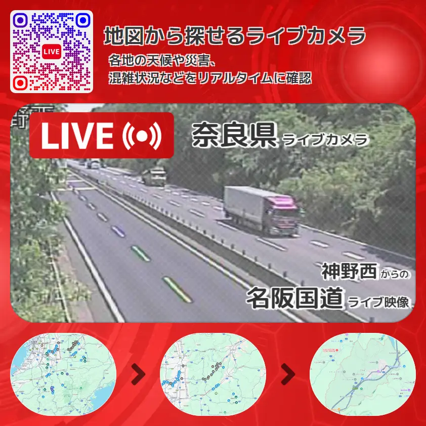 名阪国道(国道25号バイパス)の他に、高速道路(高速自動車国道に並行する一般国道自動車専用道路)や周辺の気象状況も併せてチェックすることが可能で、台風・大雨・地震などの災害による被害状況も把握することができます。
