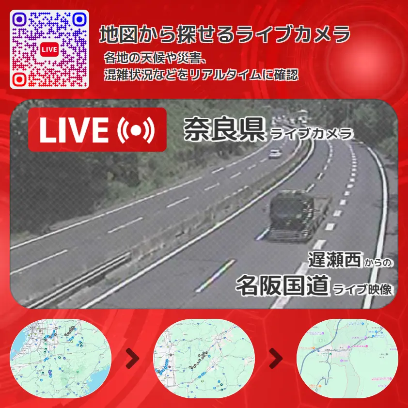名阪国道(国道25号バイパス)の他に、高速道路(高速自動車国道に並行する一般国道自動車専用道路)や周辺の気象状況も併せてチェックすることが可能で、台風・大雨・地震などの災害による被害状況も把握することができます。
