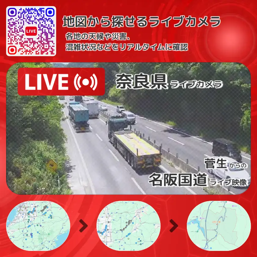 名阪国道(国道25号バイパス)の他に、高速道路(高速自動車国道に並行する一般国道自動車専用道路)や周辺の気象状況も併せてチェックすることが可能で、台風・大雨・地震などの災害による被害状況も把握することができます。