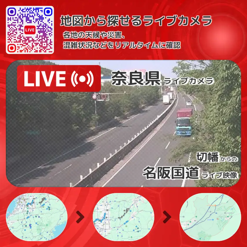 名阪国道(国道25号バイパス)の他に、高速道路(高速自動車国道に並行する一般国道自動車専用道路)や周辺の気象状況も併せてチェックすることが可能で、台風・大雨・地震などの災害による被害状況も把握することができます。
