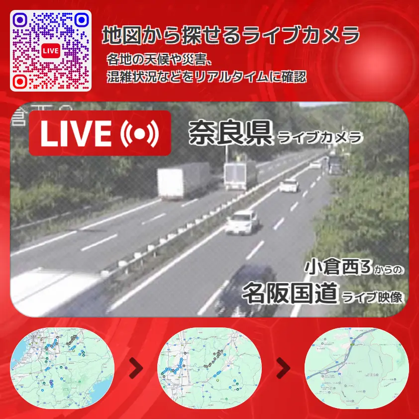 名阪国道(国道25号バイパス)の他に、高速道路(高速自動車国道に並行する一般国道自動車専用道路)や周辺の気象状況も併せてチェックすることが可能で、台風・大雨・地震などの災害による被害状況も把握することができます。