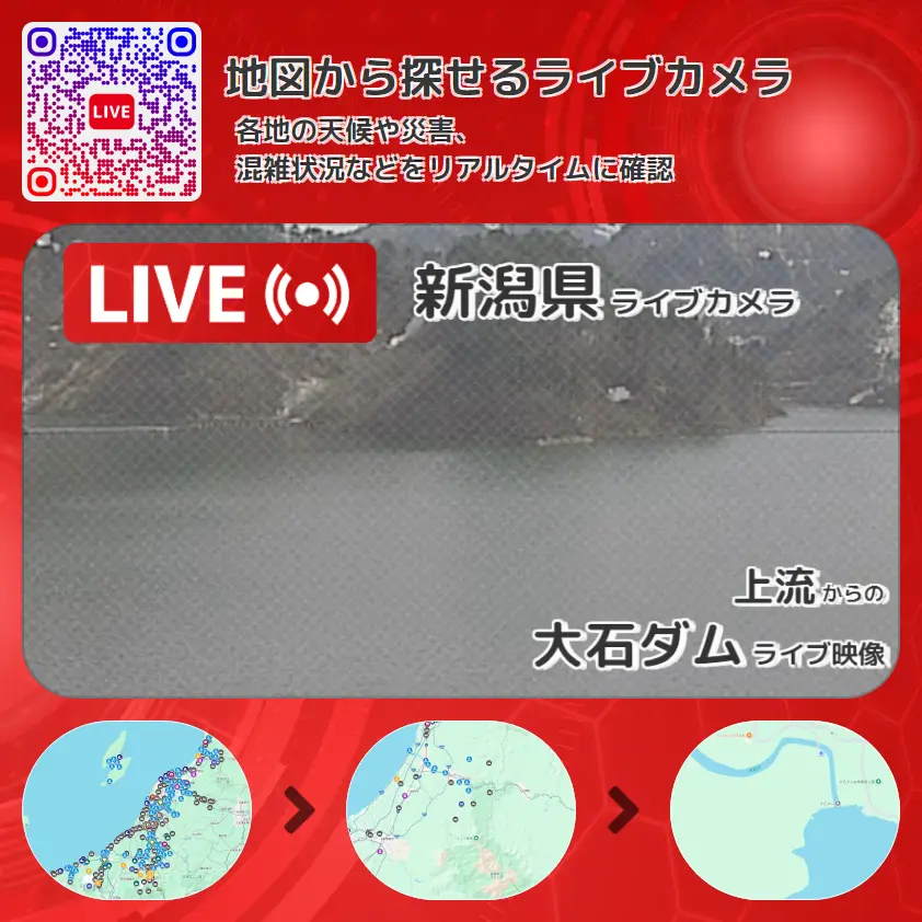 周辺の気象状況も併せてチェックすることが可能で、台風・大雨・地震などの災害による被害状況も把握することができます。