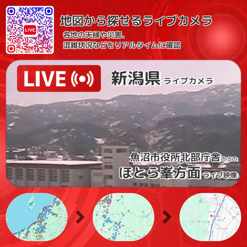 周辺の気象状況も併せてチェックすることが可能で、台風・大雨・地震などの災害による被害状況も把握することができます。