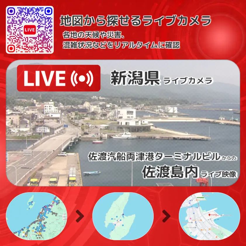佐渡島内の他に、両津港や周辺の気象状況も併せてチェックすることが可能で、台風・大雨・地震などの災害による被害状況も把握することができます。
