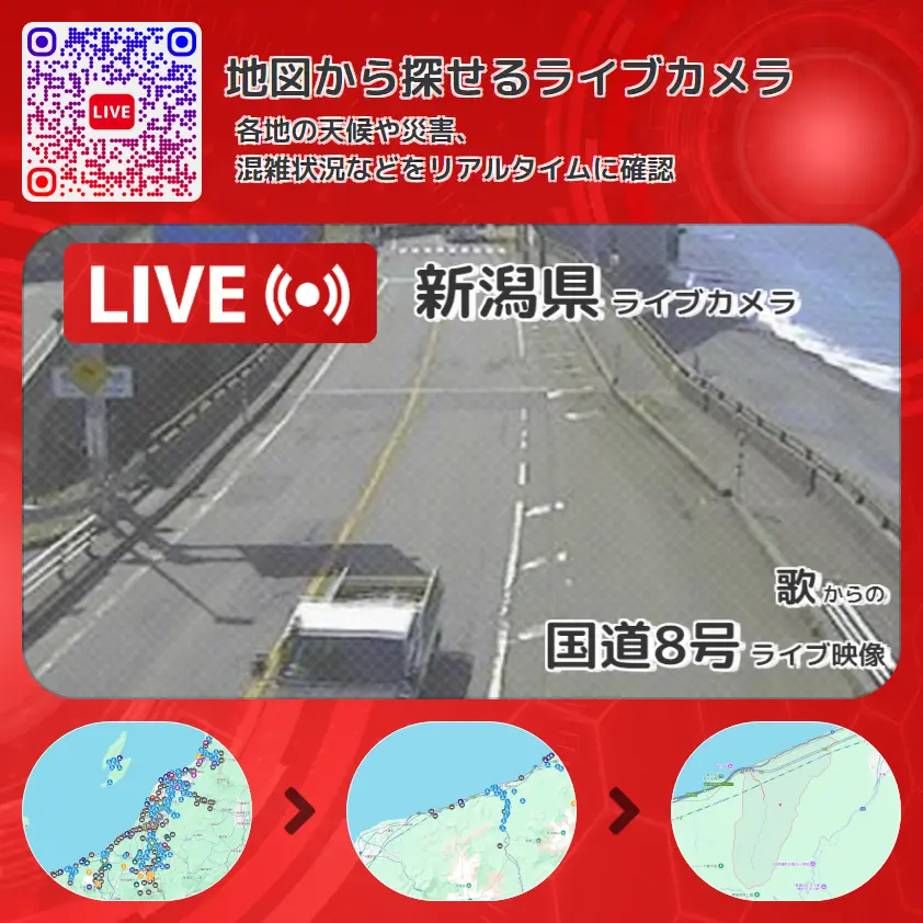 国道8号の他に、日本海や周辺の気象状況も併せてチェックすることが可能で、台風・大雨・地震などの災害による被害状況も把握することができます。