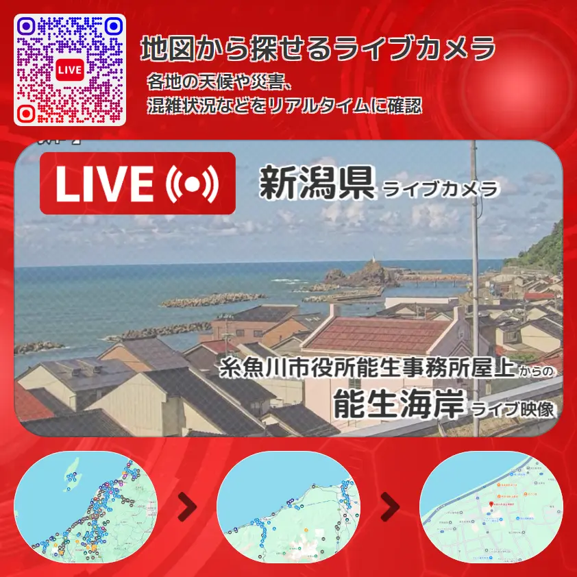 能生海岸の他に、能生灯台や周辺の気象状況も併せてチェックすることが可能で、台風・大雨・地震などの災害による被害状況も把握することができます。