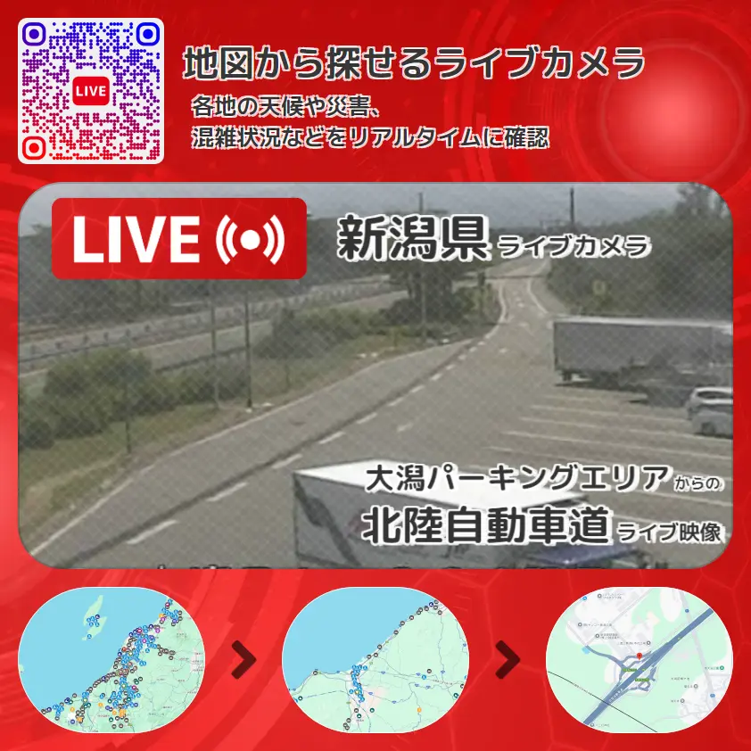 北陸自動車道(北陸道)の他に、上越インターチェンジ(上越IC)~柿崎インターチェンジ(柿崎IC)や周辺の気象状況も併せてチェックすることが可能で、台風・大雨・地震などの災害による被害状況も把握することができます。