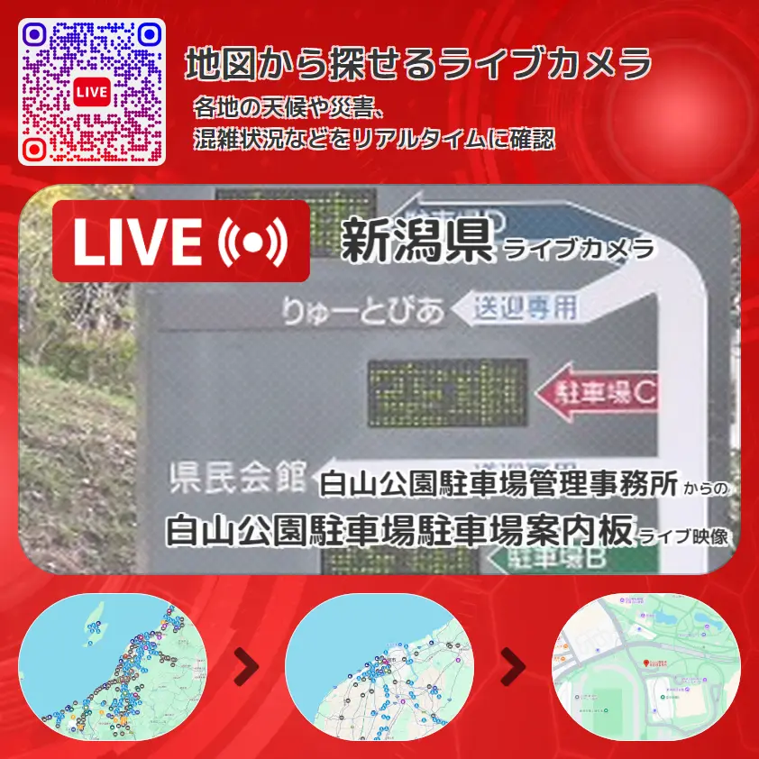 白山公園駐車場管理事務所から、白山公園駐車場駐車場案内板(BCD駐車場空車満車)が確認できるライブカメラです。