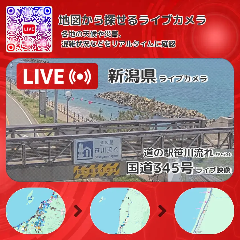 国道345号(日本海夕日ライン)の他に、日本海や周辺の気象状況も併せてチェックすることが可能で、台風・大雨・地震などの災害による被害状況も把握することができます。