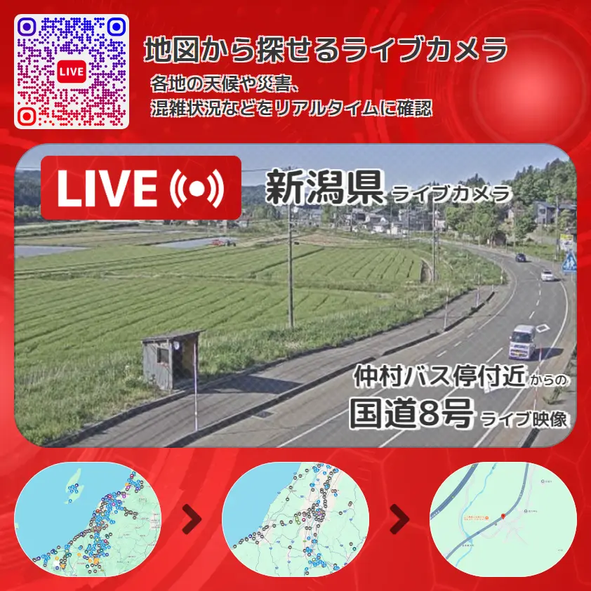 国道8号(長岡バイパス)の他に、越後交通村バス停や周辺の気象状況も併せてチェックすることが可能で、台風・大雨・地震などの災害による被害状況も把握することができます。