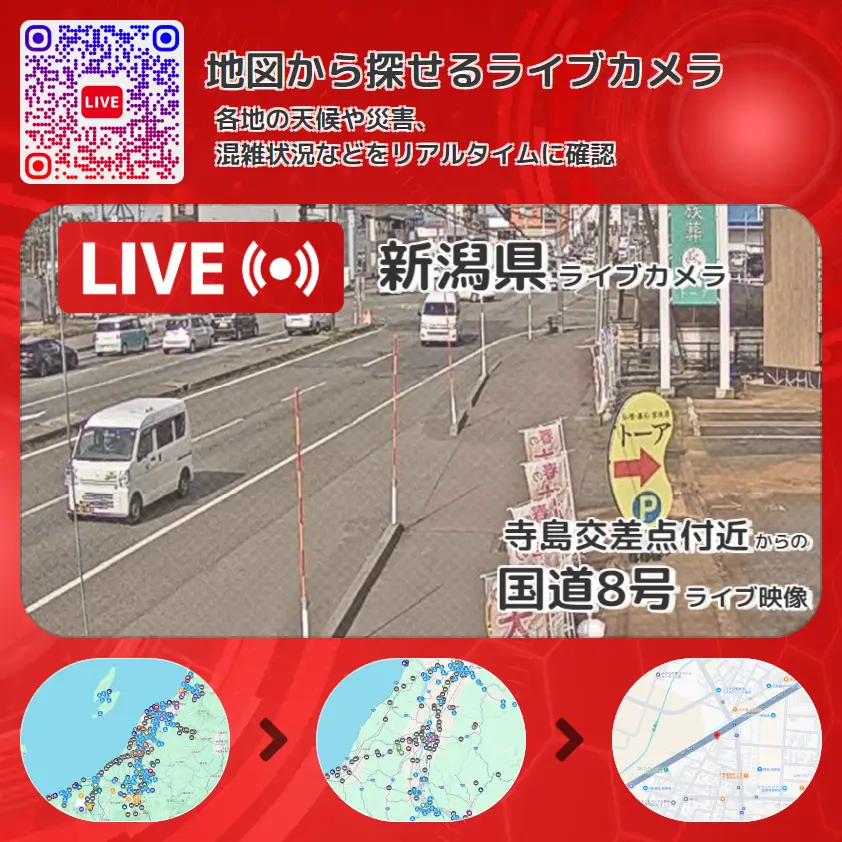 国道8号(長岡バイパス)の他に、寺島交差点や周辺の気象状況も併せてチェックすることが可能で、台風・大雨・地震などの災害による被害状況も把握することができます。
