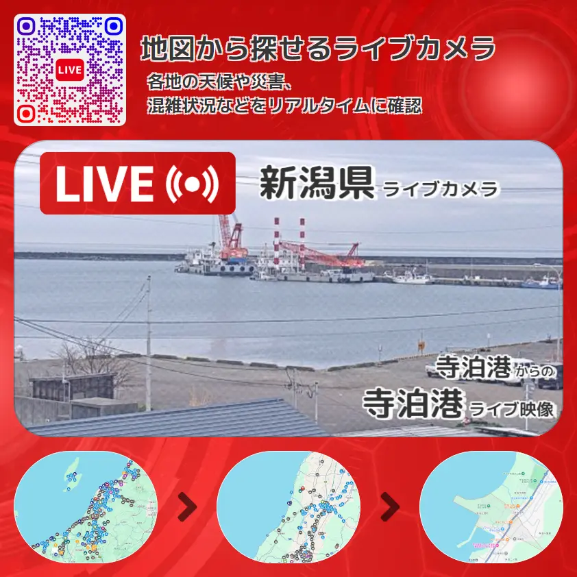 寺泊港の他に、日本海や周辺の気象状況も併せてチェックすることが可能で、台風・大雨・地震などの災害による被害状況も把握することができます。