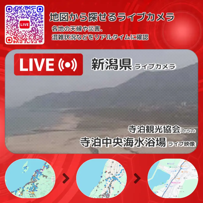 寺泊中央海水浴場の他に、佐渡汽船や周辺の気象状況も併せてチェックすることが可能で、台風・大雨・地震などの災害による被害状況も把握することができます。