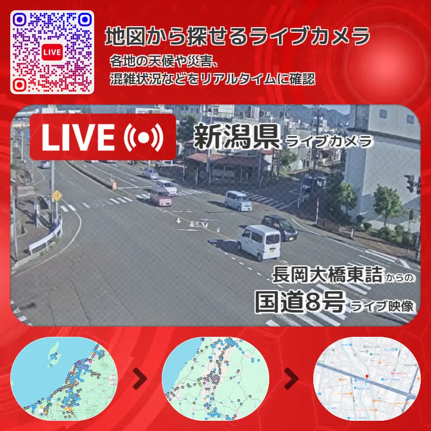 国道8号(長岡バイパス)の他に、西神田町二丁目交差点や周辺の気象状況も併せてチェックすることが可能で、台風・大雨・地震などの災害による被害状況も把握することができます。