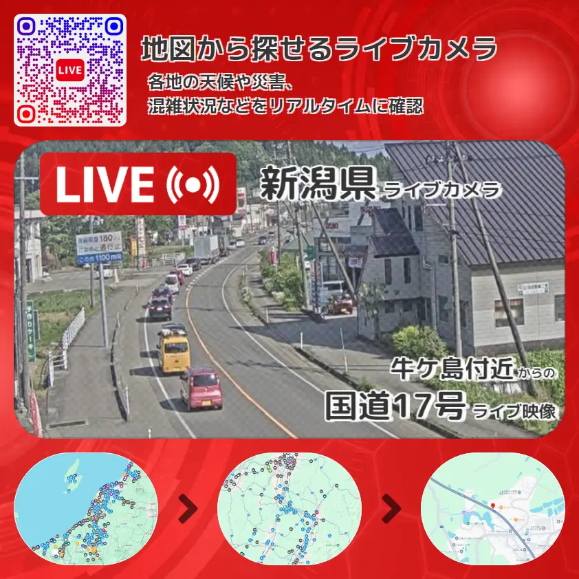 国道17号の他に、牛ケ島交差点や周辺の気象状況も併せてチェックすることが可能で、台風・大雨・地震などの災害による被害状況も把握することができます。