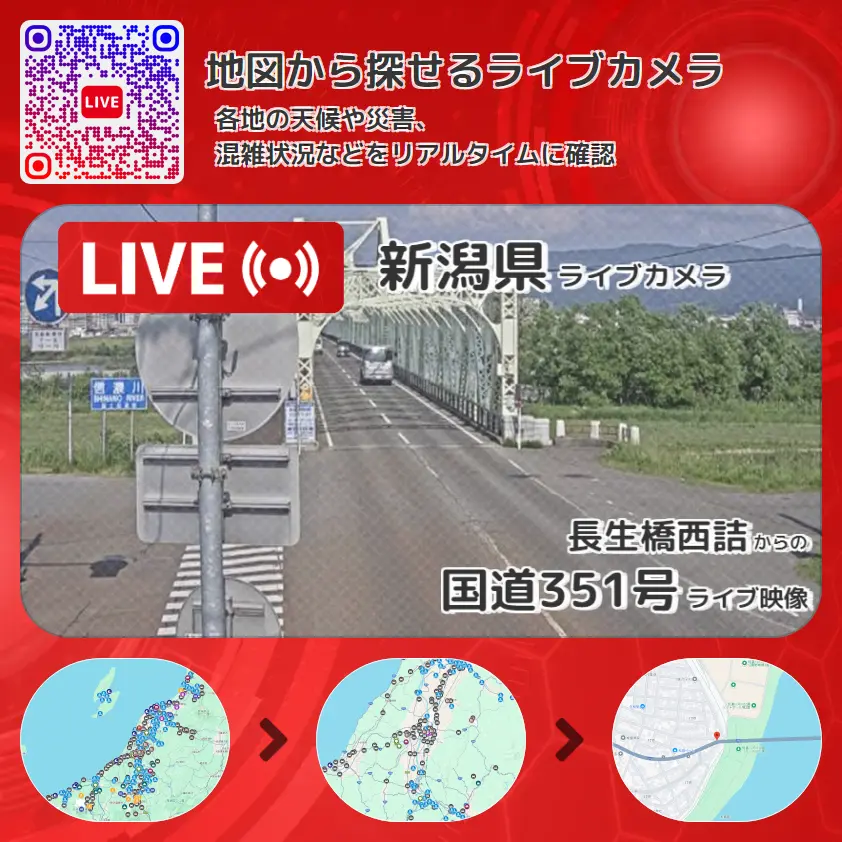 国道351号(大島通り)の他に、長生橋や周辺の気象状況も併せてチェックすることが可能で、台風・大雨・地震などの災害による被害状況も把握することができます。